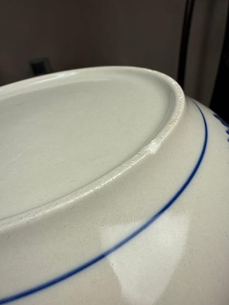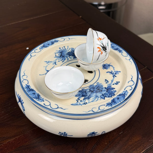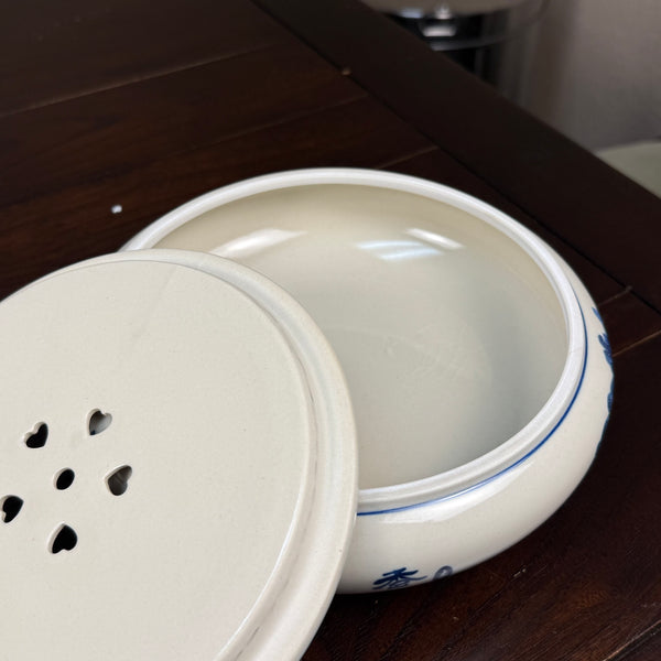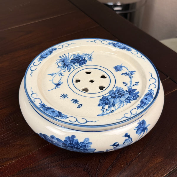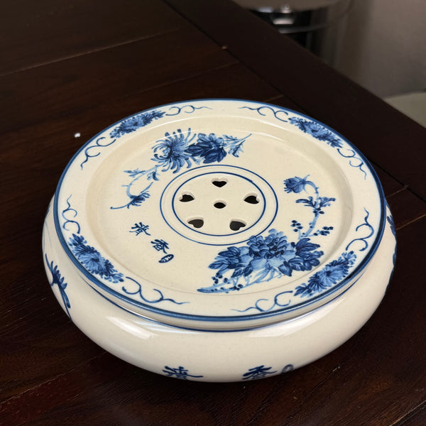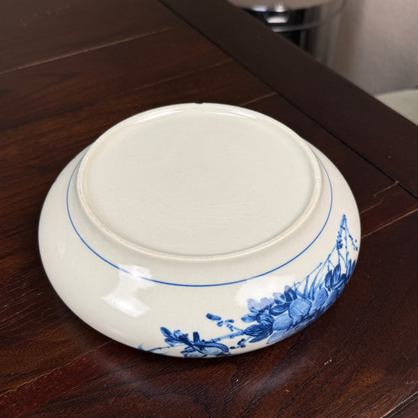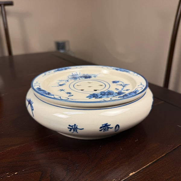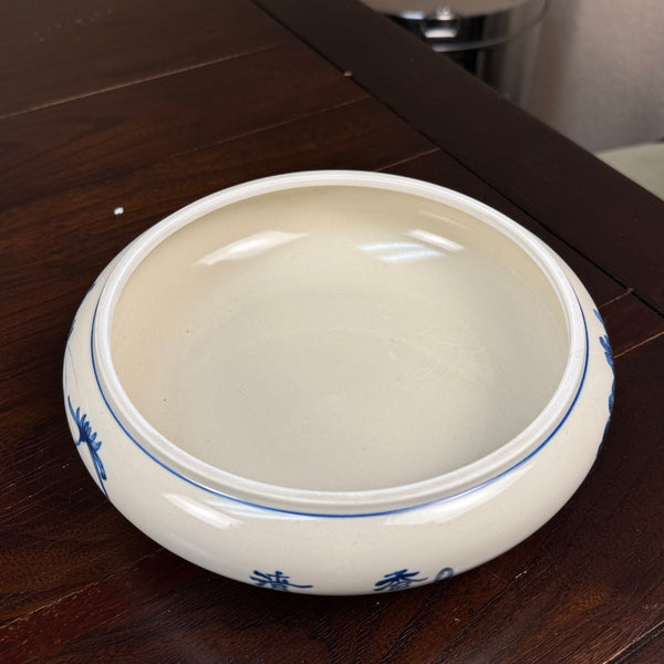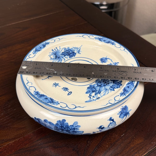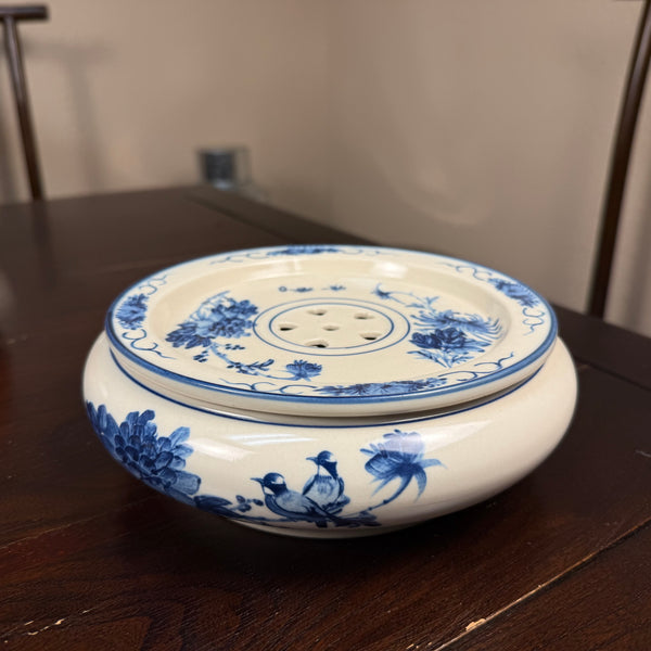 Process: Handpainted w/ blue flower and bird motif (underglaze) on off-white in antique style