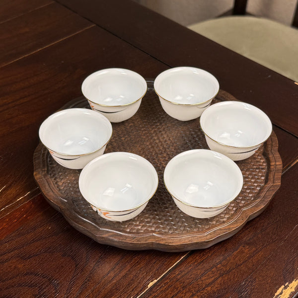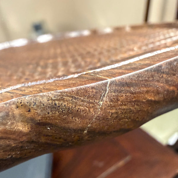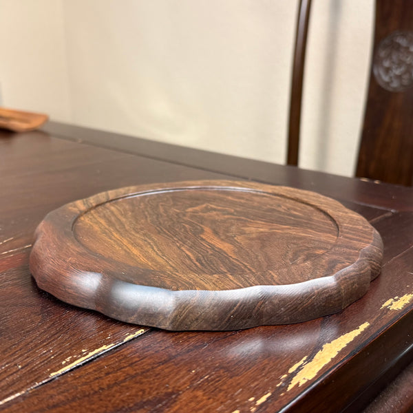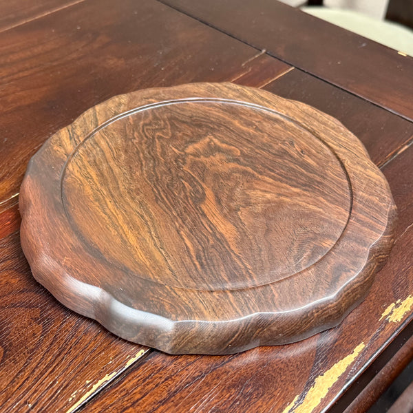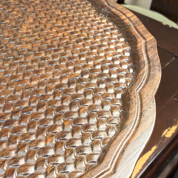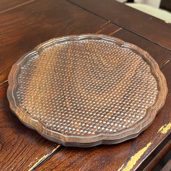 Product: Carved hardwood (sealed) lotus shaped tea tray with a woven textured pattern.